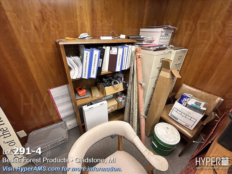 WOOD DESK WITH RIGHT-HAND RETURN, CHAIRS, SHELF, AND FOUR DRAWER FILING CABINET