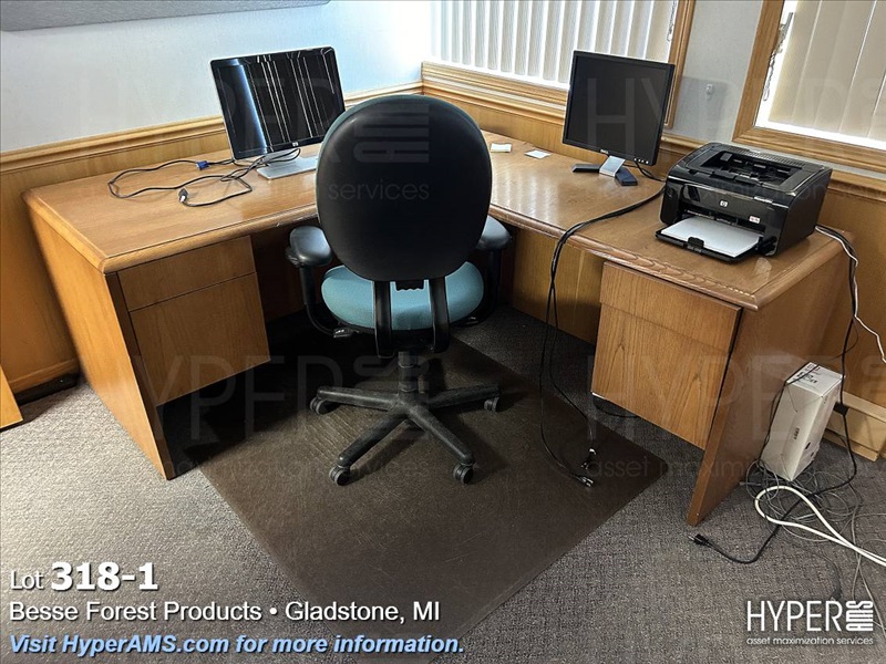 WOOD DES WITH LEFT-HAND RETURN, BOOKSHELF, AND CHAIR