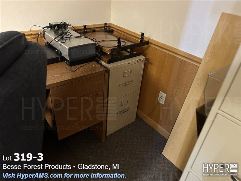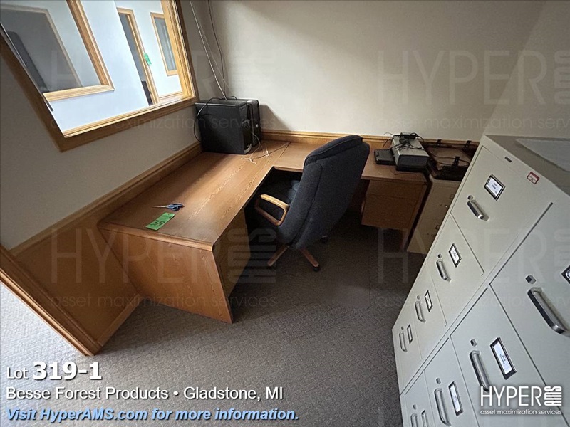 WOOD DESK WITH RIGHT-HAND RETURN, 4 FOUR DRAWER FILEING CABINET