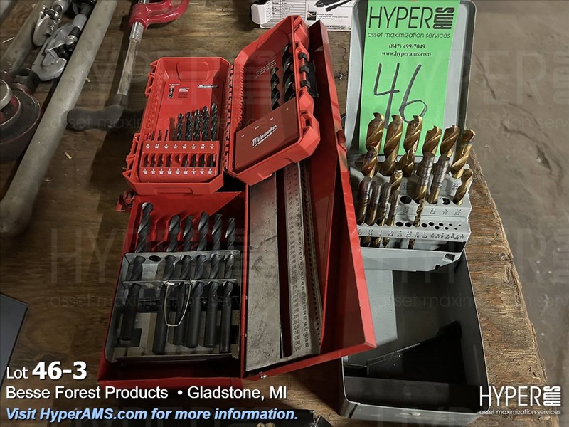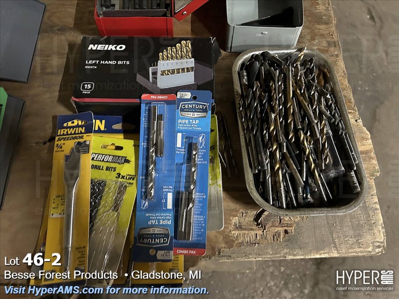 ASSORTED DRILLS IN 4 BOXES AND TRAY OF BITS, ASSORTED WOOD AND METAL BITS ON CARDS