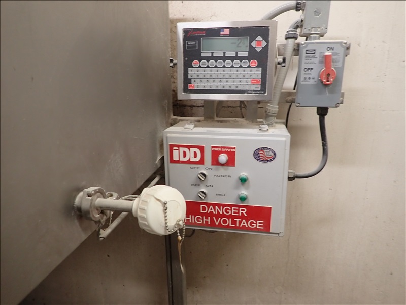 48"X48" GRIST TANK ON LOAD CELLS, CARDINAL DIGITAL READOUT, LEVEL SENSOR, CHORE-TIME, FLEX AUGER CONVEYOR, STAIRS