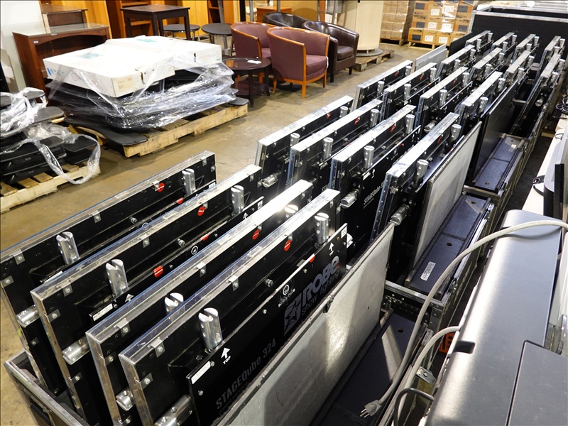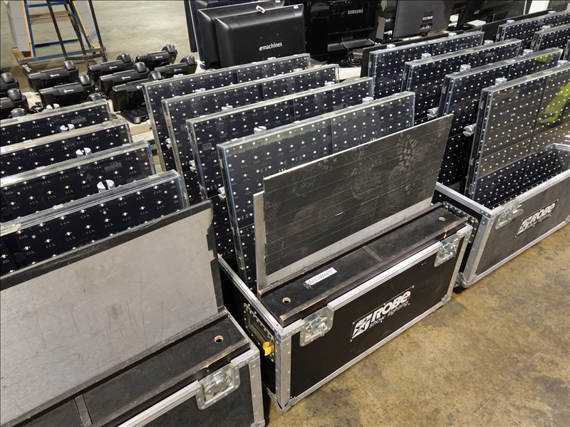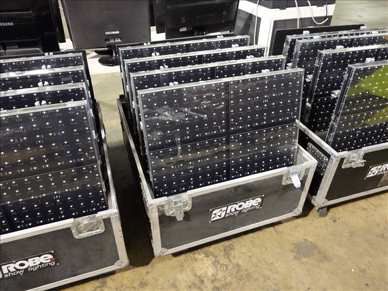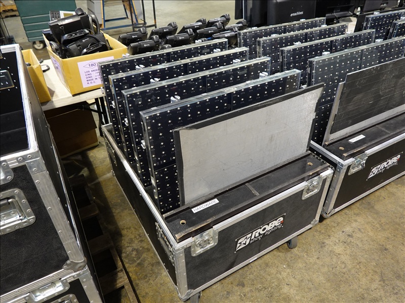 (20) ROBE STAGEQUBE 324 VIDEO PANELS (18 X 18 PX, 110 - 240V, 50/60HZ), ROBE STAGEQUBE CONTROL 4U RACK SERVER W/ (MONITOR, PERIPHERALS, AND CORDS), (6) 2'X2' STEEL BASE PLATES, (5) ROBE STACKABLE ROAD CASES W/CASTERS, (20+) CAT5 ETHERNET PATCH CABLES, (20) 10/3 POWERCON 5' JUMPER A/B CABLES, (3) 10/3 POWERCON 5' IEC CABLES, (80+) LOCKING BRACKETS W/ PINS AND RETAINER CLIPS W/CASE + MISC TOOLS, 35FT VGA CABLE, ANTI GLARE MESH TARP 10'X12'