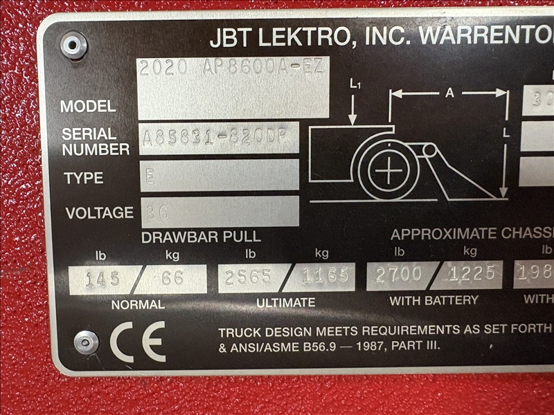 3000 LB ELECTRIC TUG W/1000 LB FRONT LIFT @ 19" HEIGHT, DRAWBAR PULL: 2565 LBS, 36V LESTRONIC II PORTABLE CHARGER