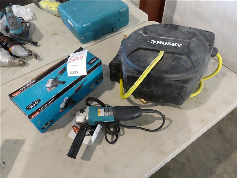 LOT, (2) MAKITA 5" SJS ANGLE GRINDERS & (1) HUSKY AIR HOSE REEL