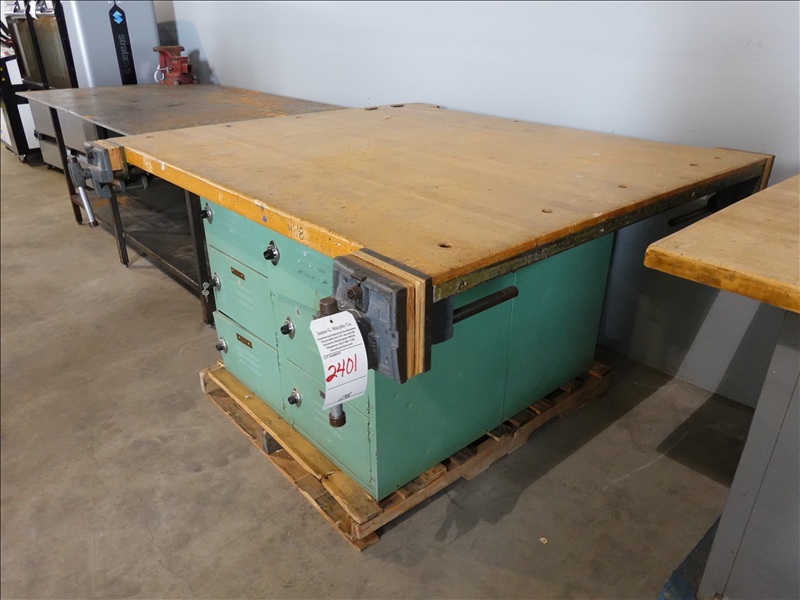 64" X 54" WORK TABLE W/(4) WILTON 7" VISES & (12) LOCKERS