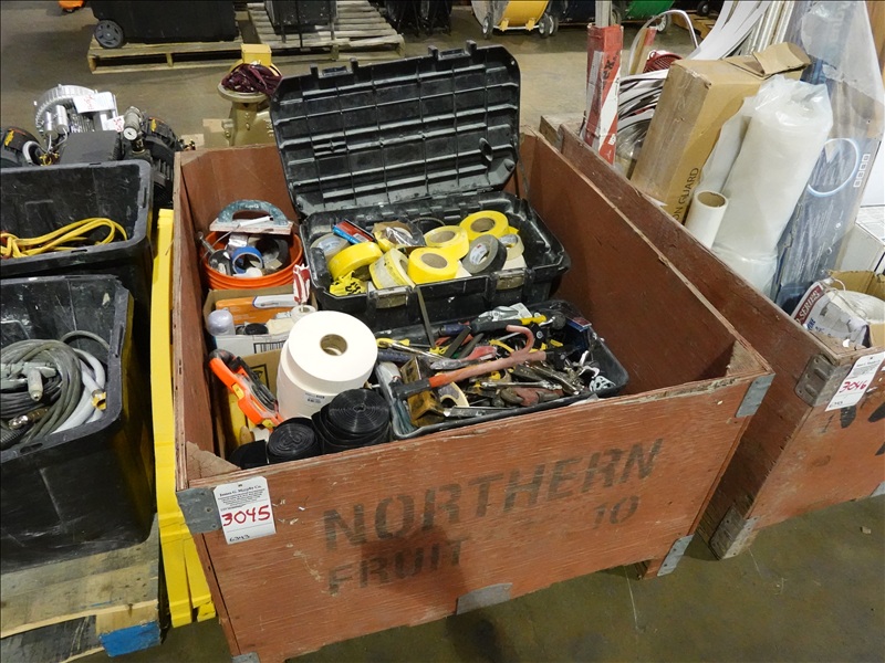 LOT, ASSORTED TOOLS & DRYWALL SUPPLIES IN THIS BIN (BIN NOT INCLUDED)