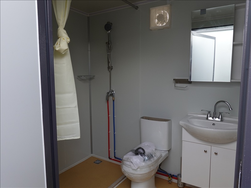 7' X 5.5' X 7.5' PORTABLE RESTROOM W/TOILET SINK, SHOWER, LIGHTS, WINDOW, FUME EXTRACTOR & FORK POCKETS, 110V (UNUSED, MEASUREMENTS ARE APPROX)