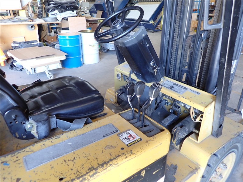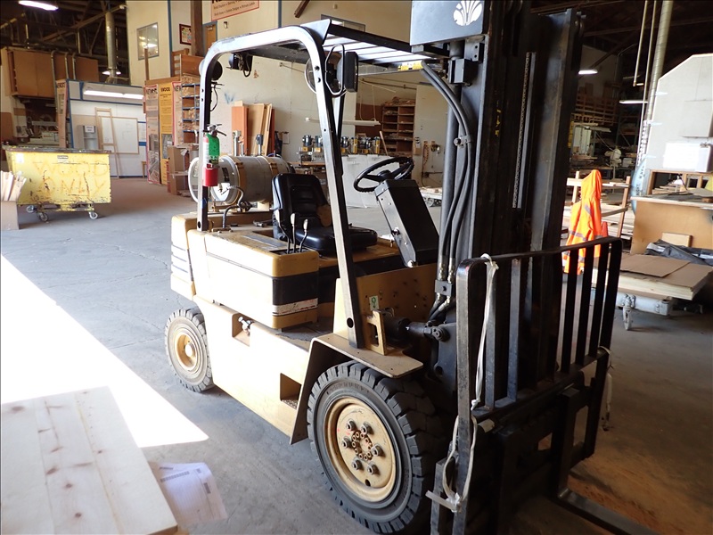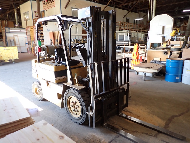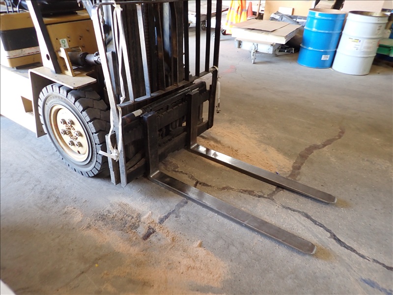 5,000 LB CAP. CUSHION TIRED FORKLIFT, 188" 3-STAGE MAST, SIDE SHIFT, PROPANE, S/N: 10-01381, HRS: 7,060