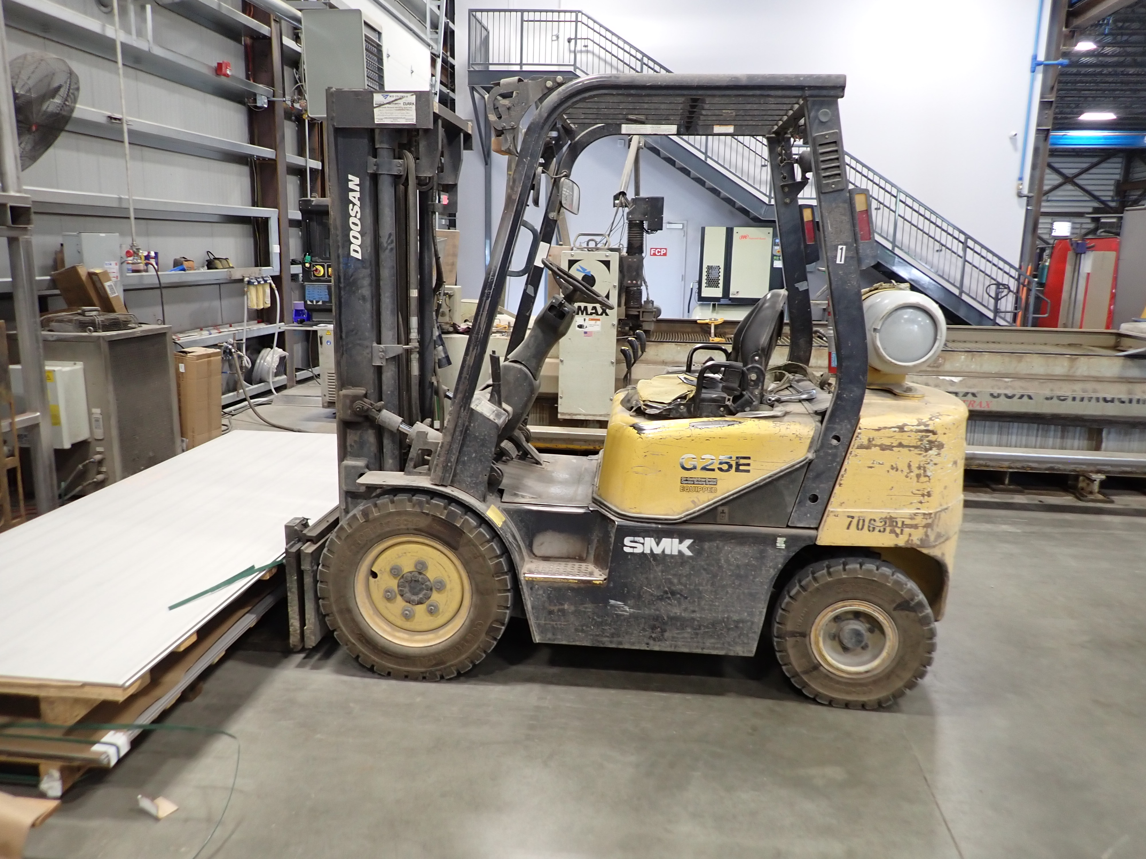 4,500 LB CAP. CUSHION TIRED FORKLIFT, 186" 3-STAGE MAST, SIDE SHIFT, PROPANE, DUAL FUEL