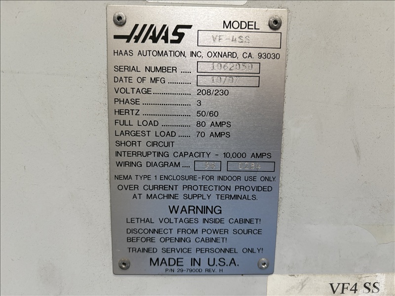 CNC VERTICAL MACHINING CENTER W/18"X52" TABLE, 40-STATION SIDE MOUNT ATC, CAT 40, INTERNAL CHIP AUGER, WIRED FOR 4TH AXIS, THRU SPINDLE COOLANT, 12,000 RPM SPINDLE, HAAS CONTROLS, PENDANT CONTROL, 208/230V, 3 PHASE