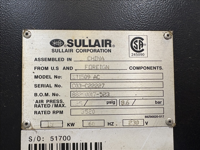 20 HP/15 KW ROTARY SCREW TOTAL AIR CENTER, 230V, 3 PHASE