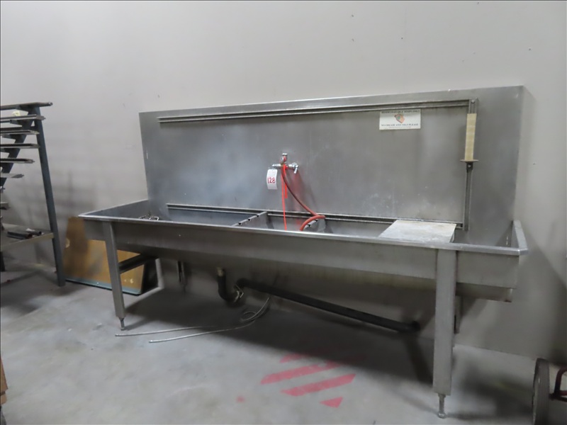 STAINLESS STEEL SINK, 123"L X 31"W W/32" BACKSPLASH (WATER LINE DISCONNECTS AFTER VALVE, DRAIN DISCONNECTS AT FIRST JOINT)