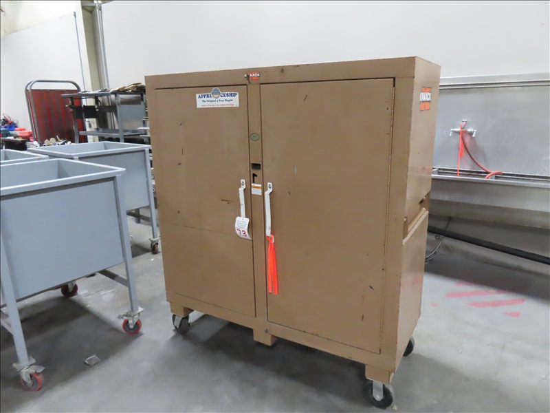 5'L X 2'W X 67"H JOBSITE STORAGE CABINET ON CASTERS (BROKEN DOOR LATCH)