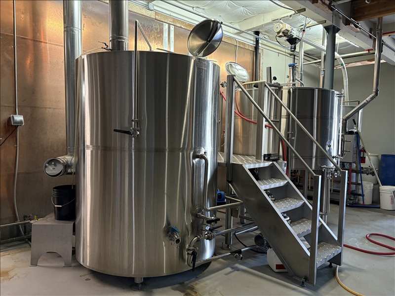 15-BARREL 2-VESSEL S.S. BREW HOUSE W/230V 3-PH JACKETED MASH MIXING STATION KETTLE, THERMALINE 15152-CS-51 HEAT EXCHANGER, GAS JACKETED BOIL KETTLE, LEESON SM4 INVERTER DRIVE, TOUCH SCREEN CONTROLS, COLD WATER OUTLET, PLATFORM