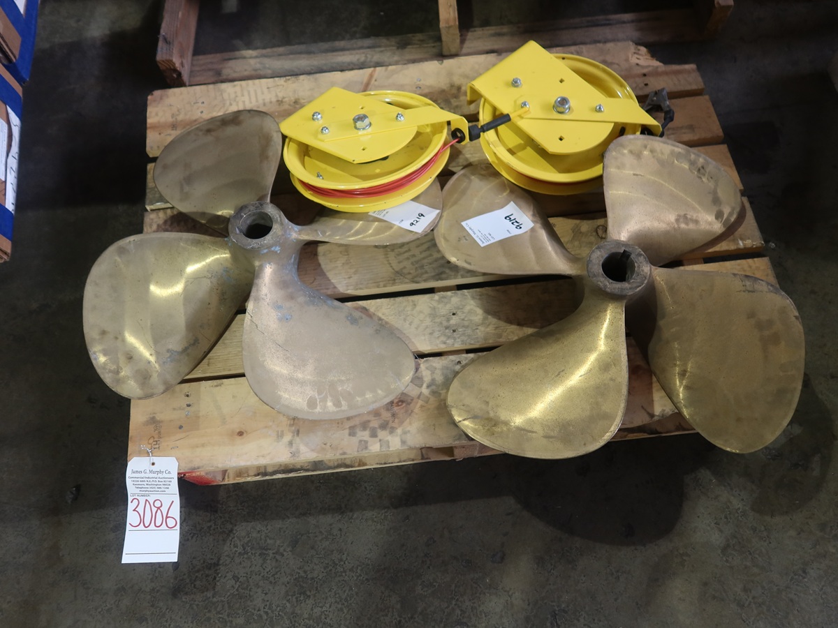 LOT, (2) 26X20 4-BLADE PROPELLERS & (2) BOLT-ON RETRACTABLE WIRE REELS