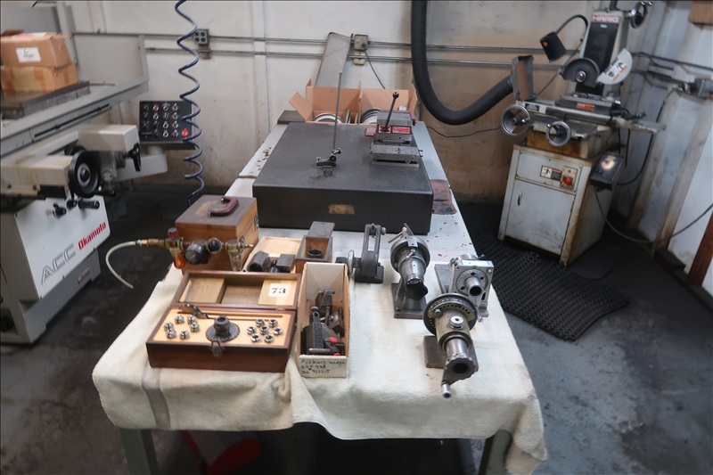 MACHINE TOOLING TO INCLUDE KURT SIDE WINDER VISE (UNUSED), CAT40 TOOL HOLDERS, ROTARY TABLE, INDEXERS, ANGLE PLATES, AIR CLAMP, SPIN FIXTURES, RADIUS DRESSERS, JIG GRINDER & INDEXING FIXTURES