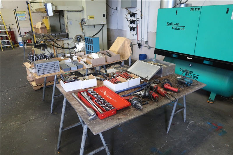 MISC. TOOLS TO INCLUDE MILWAUKEE & ROCKWELL MAG DRILLS, MILWAUKEE COMPOUND MITER SAW, ENERPAC PORTA POWERS, ABRASIVE SAW, MILWAUKEE RECHARGEABLE TOOLS, ROLLING TOOLBOXES, NUMEROUS POWER TOOLS, PULLER SET, TABLETOP & STAND MOUNT GRINDERS, (3) PALLET JACKS