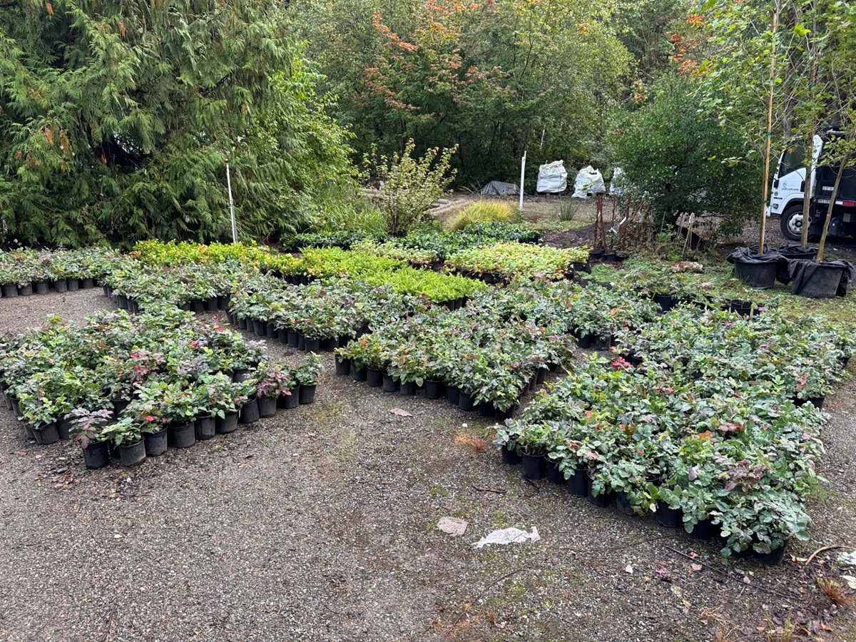 APPROX 1300 1 GALLON PLANTS TO INCLUDE: MAHONIA, LOW GROWING LAUREL, GERANIUM, SWORD FERN, SALAL, (3) 2” CALIPER LONDON PLANE TREES