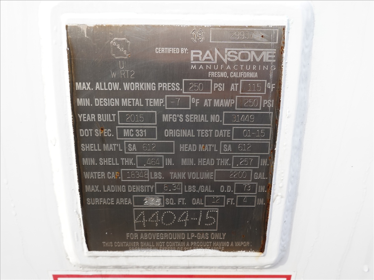 PROPANE DELIVERY TRUCK, 250 HP PACCAR PX-7, AUTO, A/B, 2015 RANSOME 2,200 GALLON STEEL TRUCK TANK, MC-331, PTO DRIVE PUMP, LIQUID CONTROLS MA7-10 METER W/VEEDER ROOT TICKET PRINTER
