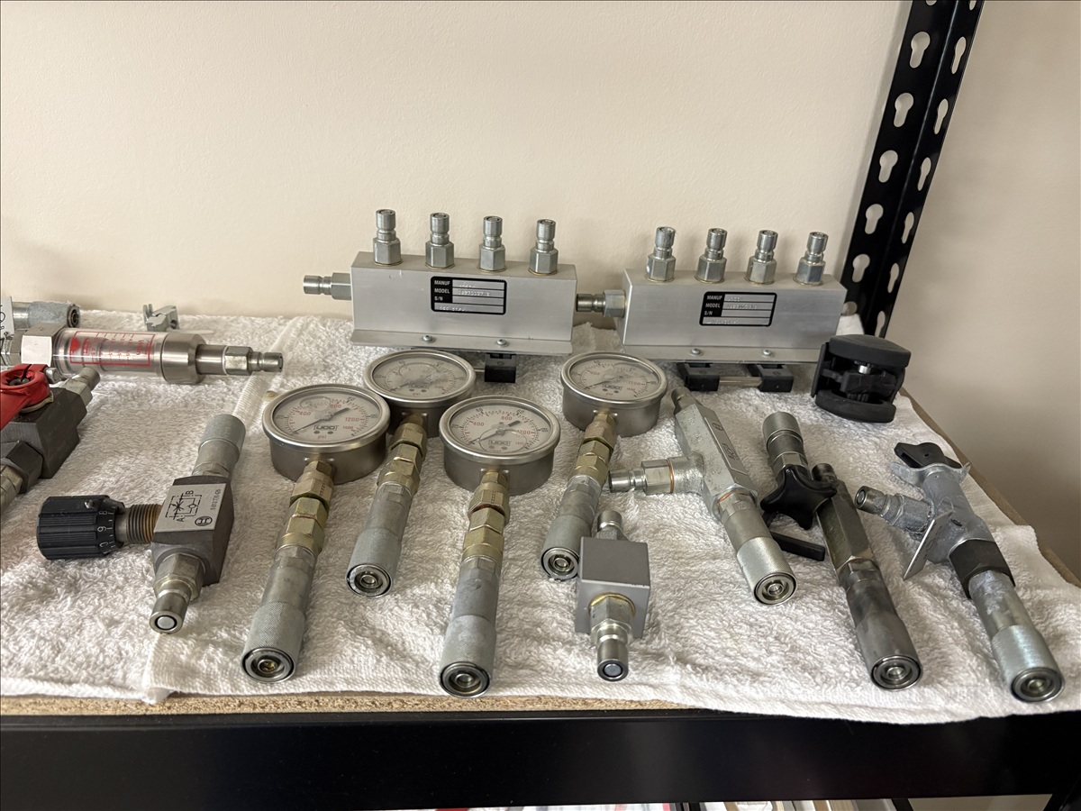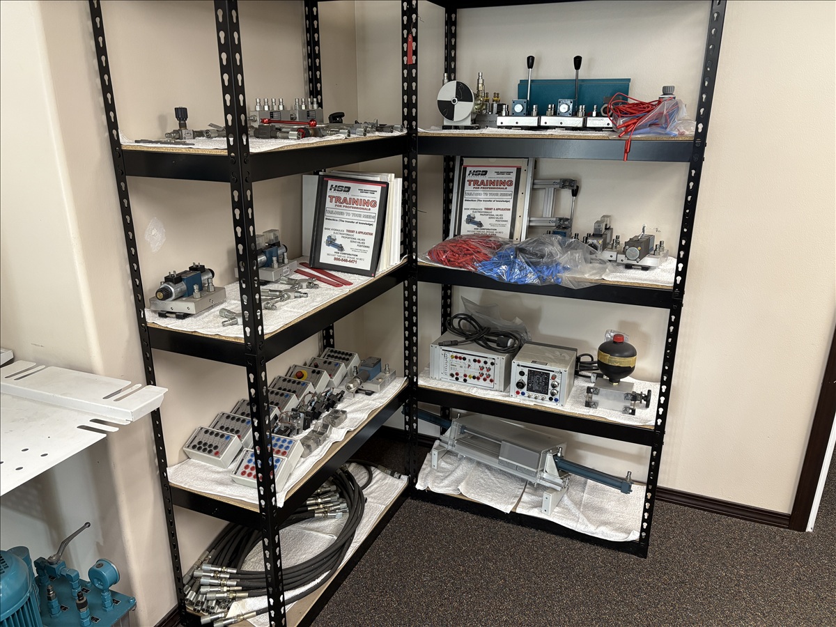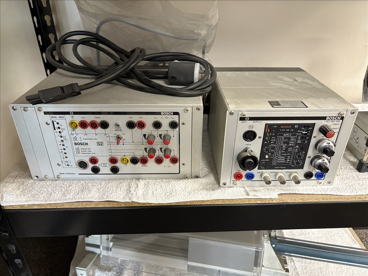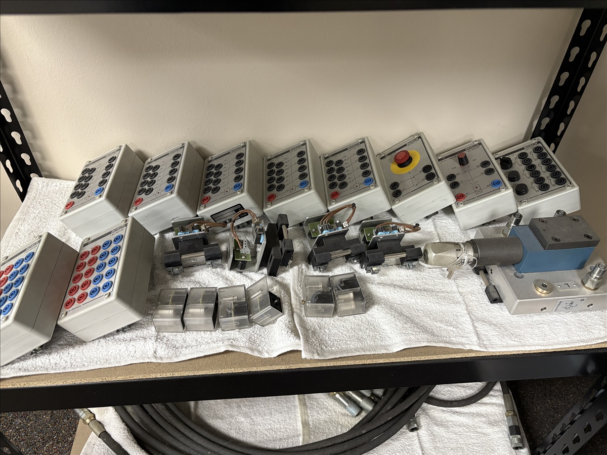 HYDRAULIC TRAINING PLATFORM WORK STATION SYSTEM ON CASTORS W/BOSCH WV12-RGC2 TEST STATION, AMPLIFIER MODULE, (2) PORTABLE HYDRAULIC POWER UNITS, ASSORTED VALVES, ACCESSORY PARTS & HOSE