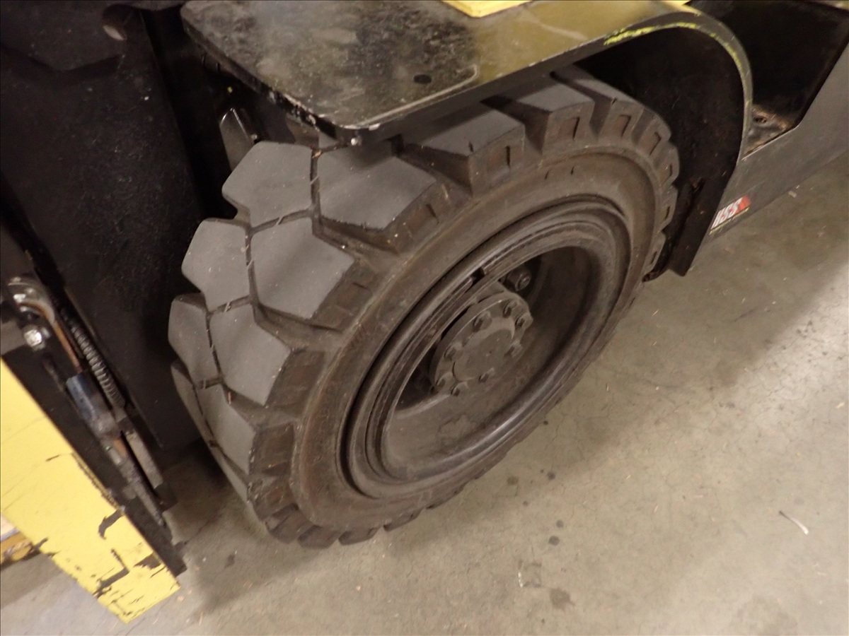 5,700 LB CAP. CUSHION TIRED FORKLIFT, 188" 3-STAGE MAST, FORK POSITIONERS, SIDE SHIFT, PROPANE, S/N: A380V10858V, HRS: 1,010