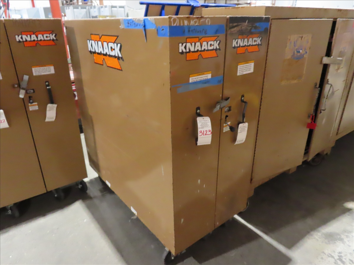 FOLDING TOOL STORAGE CABINET ON CASTERS, APPROX 60"L X 30"W X 65"H (UNLOCK HANDLE BROKEN, NEEDS REPAIR)