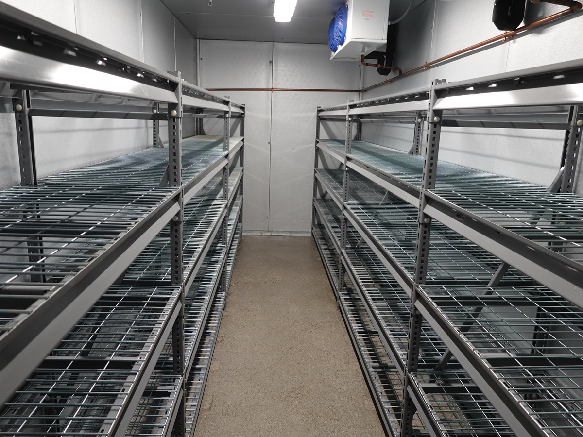 APPROX 17'X8'X8' WALK-IN COOLER W/(2) LARKIN 2-FAN CONDENSING UNITS, (2) ROWS 15' METAL SHELVING, DOOR & LIGHTS (DOESN'T INCLUDE COMPRESSOR)