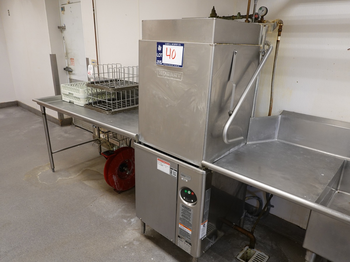 SINGLE RACK ELECTRIC HIGH TEMP DISHWASHER W/78" DIRTY DISHTABLE, 72" CLEAN DISHTABLE, 8' WALL MOUNTED DISHRACK SHELF, RINSE WANT & DISH RACKS, 208-240V, 3-PH
