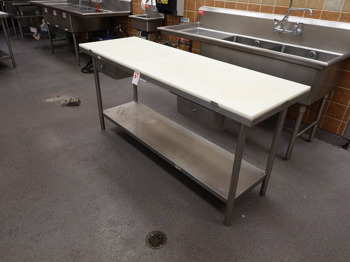 72"X30" S/S TABLE W/FULL POLY TOP, (2) DRAWERS, BACKSPLASH & LOWER SHELF