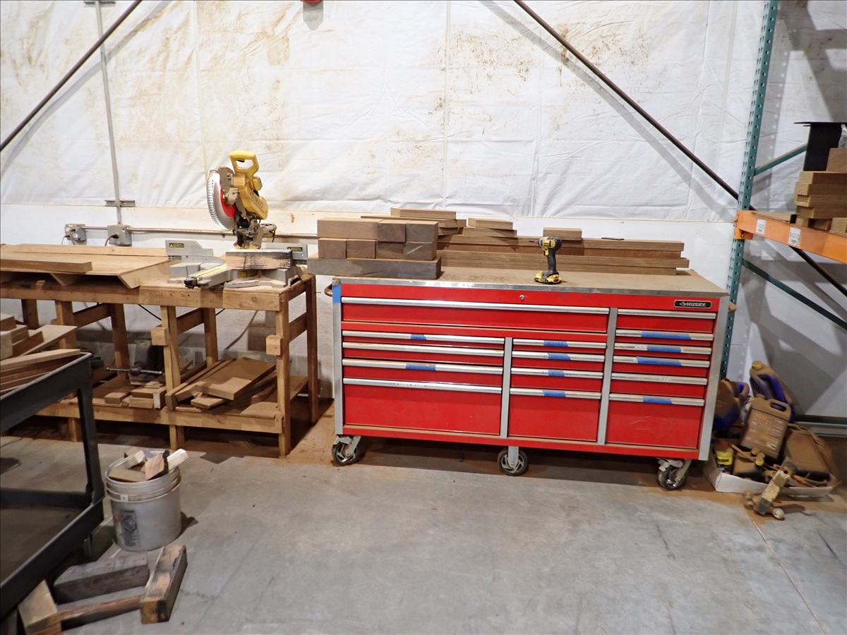 HUSKY ROLL-A-WAY TOOLBOX, DEWALT MITER SAW & MISC.
