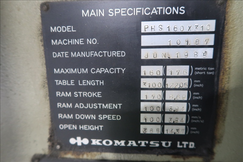 160-TON X 10' HYDRAULIC PRESS BRAKE, 122-1/2" TABLE LENGTH, 6.69" RAM STROKE, 3.94" RAM ADJUSTMENT, 3.94" RAM SPEED, 14.37" OPENING HEIGHT,