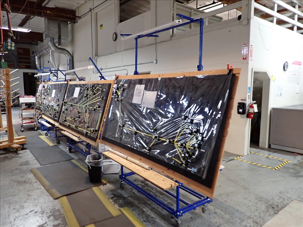 GROUP OF (7) LIGHTED SINGLE SIDED WIRE HARNESS ASSEMBLY STATIONS ON CASTERS