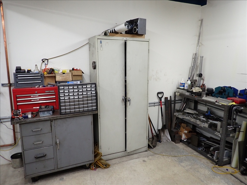 GROUP OF GRINDER, LADDER, TOOLING, SHARPENER, HOLD DOWNS, CARTS, TOOLING & MISC.