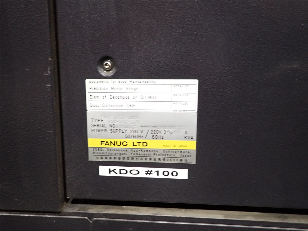 4,000 WATT CNC LASER, 5'X10' TABLE, 2-PALLET SHUTTLE, FANUC AF4000E POWER SUPPLY, DONALDSON DUST COLLECTOR, RKE15000A-VA-UU CHILLER, ORION QSQ180W AIR DRYER, CONTROLS, WORKSTATION