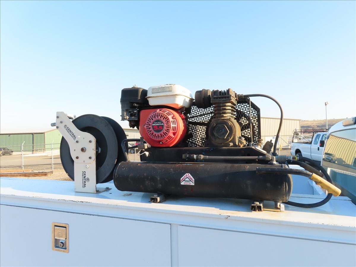 CREW CAB, SERVICE BODY PICKUP, 105" SERVICE BODY, TOMMY GATE HYDRAULIC LIFTGATE, 8-GAL AIR COMPRESSOR W/HONDA GX160, V8 AUTO, 4WD, P/WDW, P/LOCK, P/MIRROR, CRUISE, TILT, HANDS FREE, ODOMETER READS: 141,655 (CRACKED WINDSHIELD)