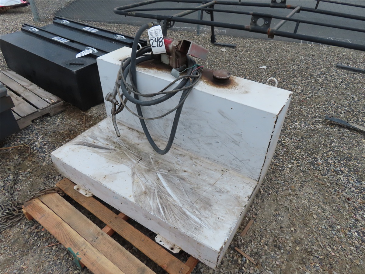 78-GAL SLIP TANK W/FILL-RITE 15 GPM PUMP, HOSE, NOZZLE & CONTENTS (PUMP NEEDS REPAIR, BUYER IS RESPONSIBLE FOR REMOVAL OF CONTENTS)