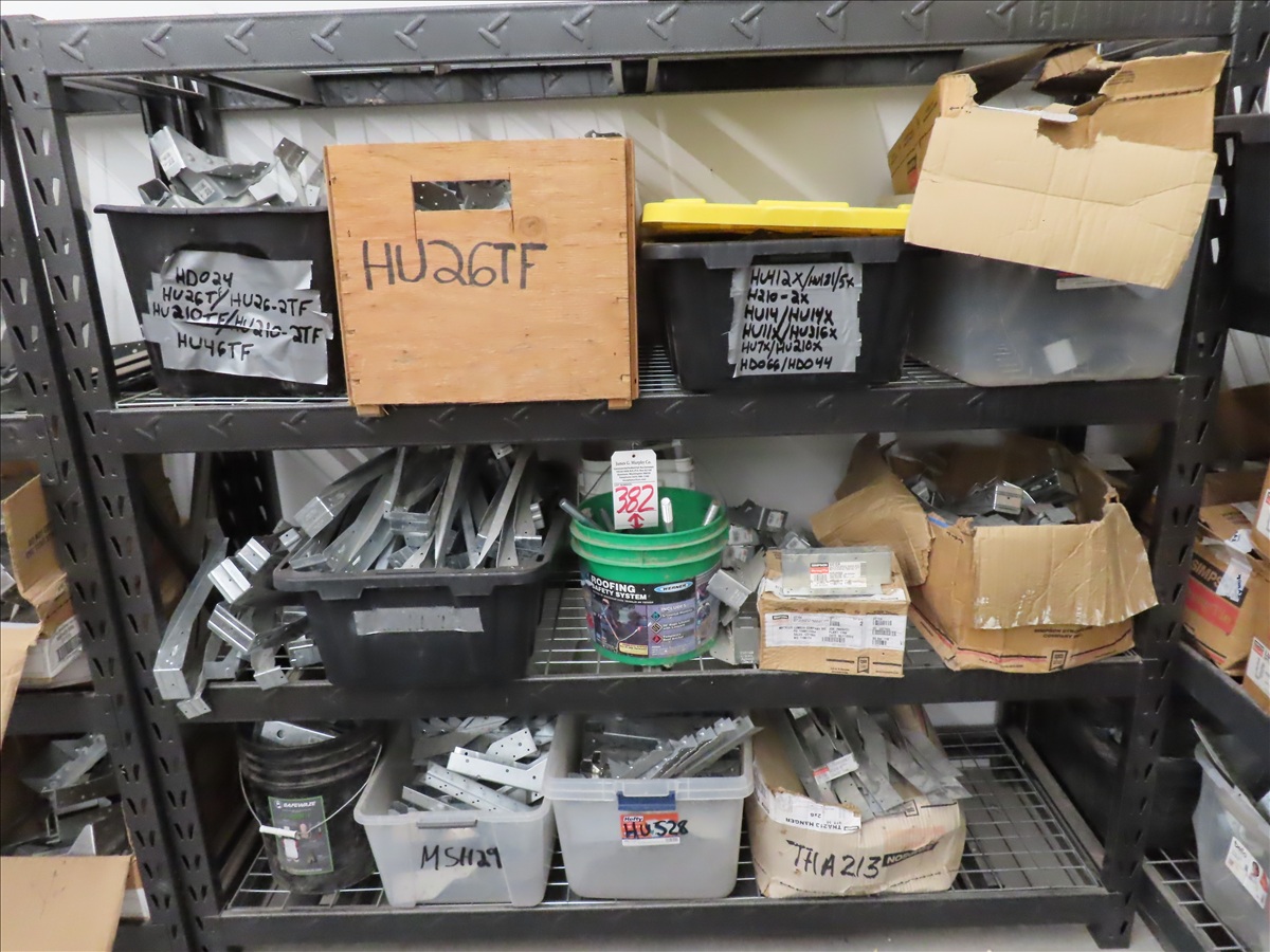 LOT, ASSORTED SIMPSON STRONGTIE HARDWARE ON THIS SHELF W/SHELF