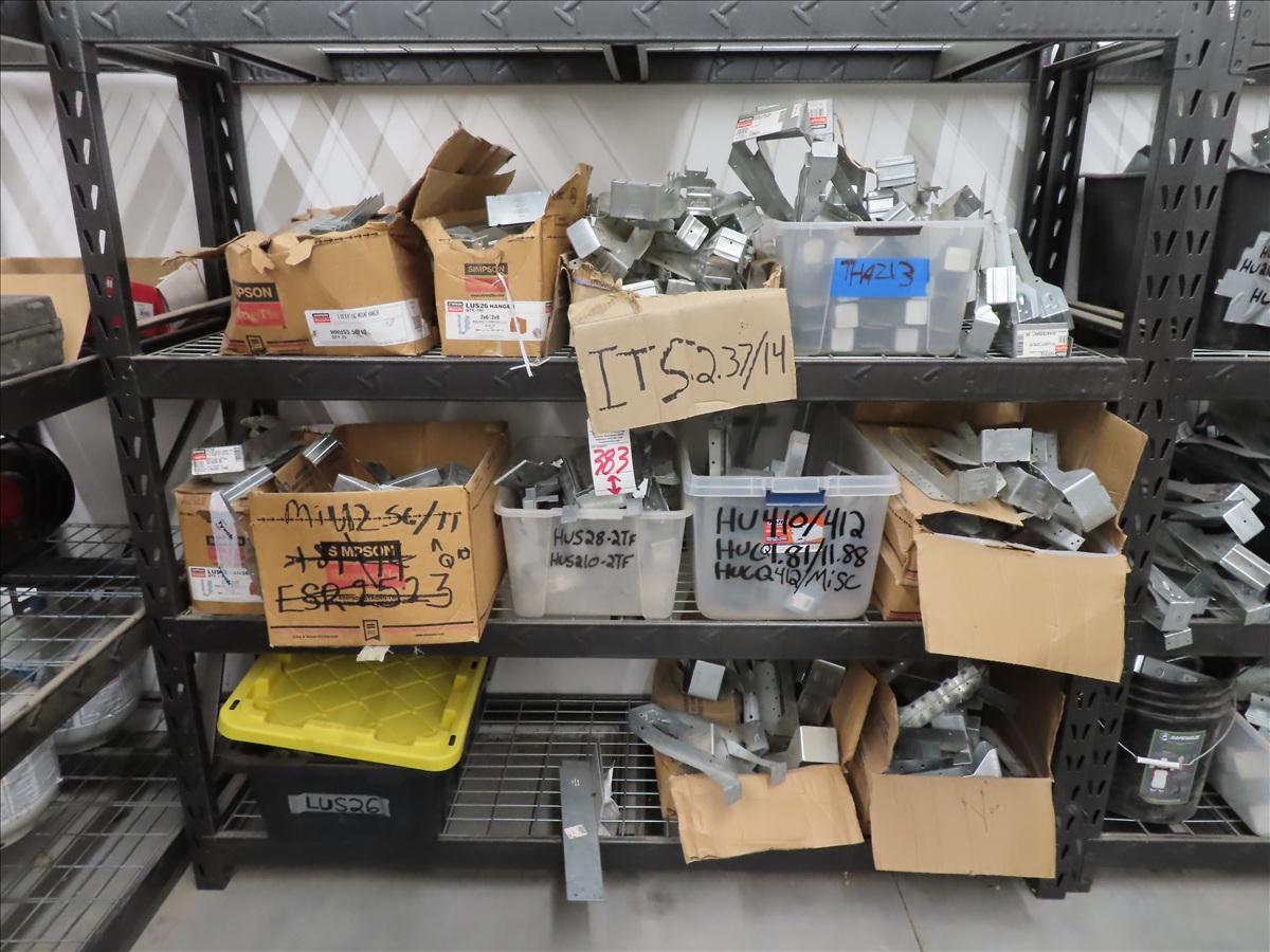 LOT, ASSORTED SIMPSON STRONGTIE HARDWARE ON THIS SHELF W/SHELF