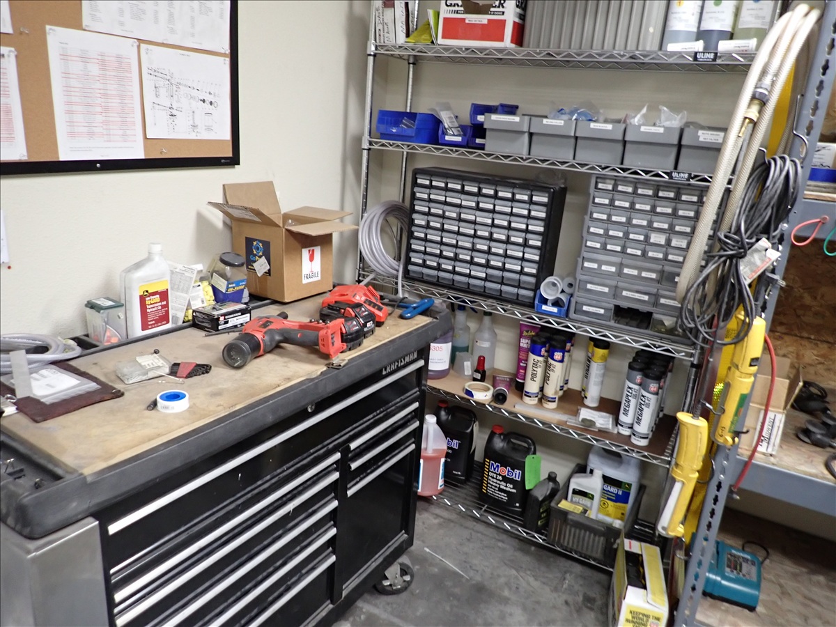 GROUP OF TOOLBOX, FOOT PEDALS, WELDING GUNS, HAND TOOLS & MISC.