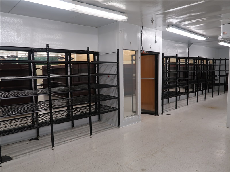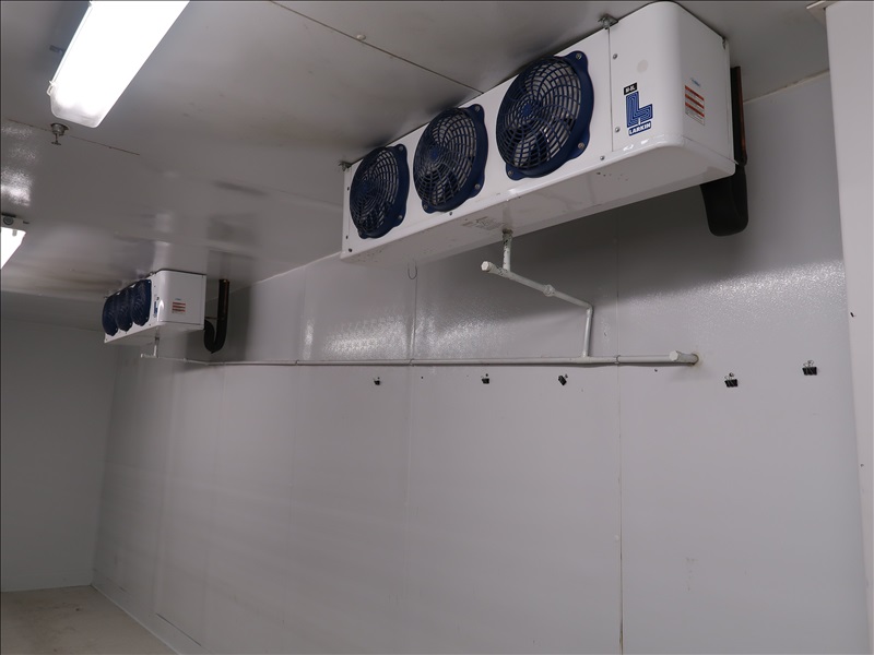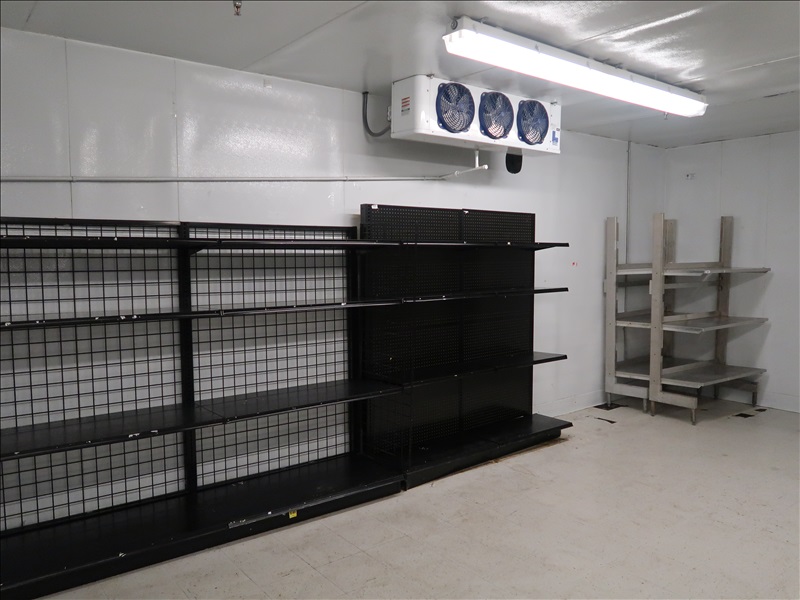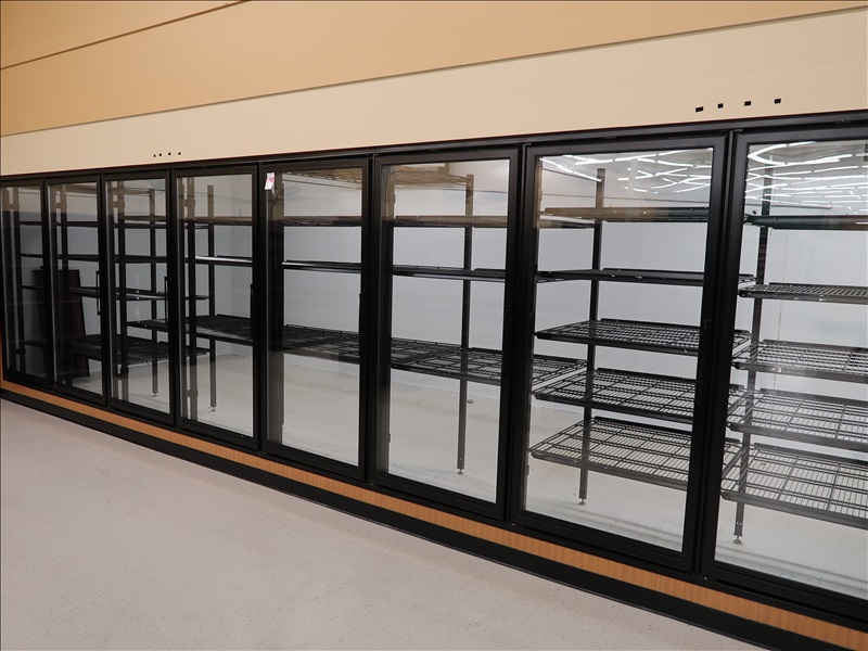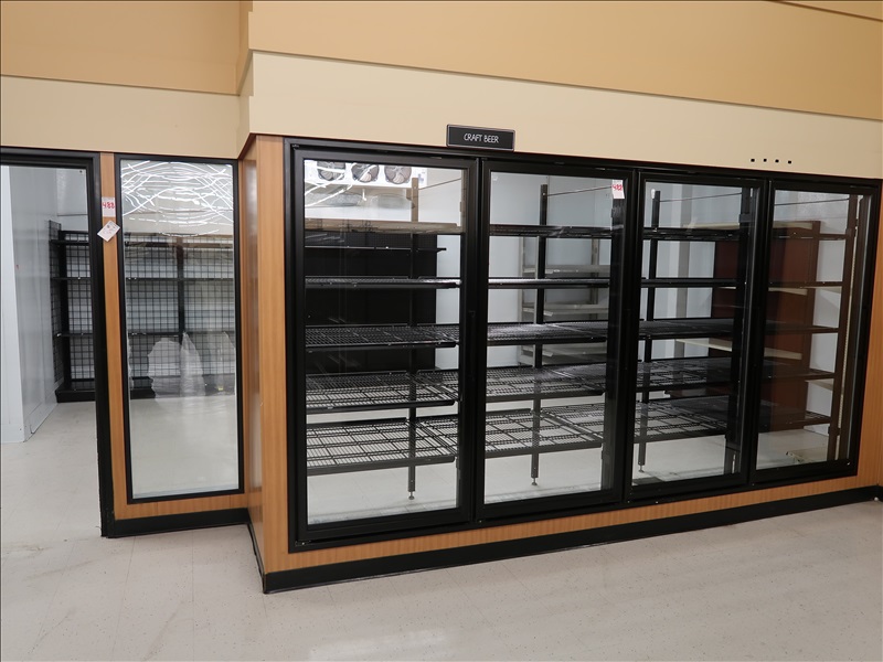 CUSTOM BUILT APPROX 50' L-SHAPED WALK-IN BEER COOLER W/(1) MAN DOOR, (12) REACH-IN DOORS, (3) LARKIN CONDENSING UNITS & SHELVING