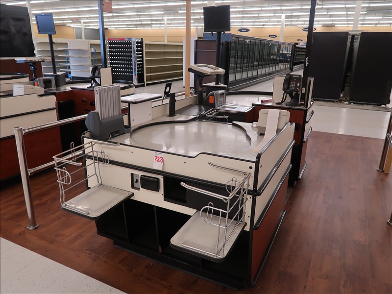 CHECKSTAND TO INCLUDE: SCANNER, SLIP PRINTER, READOUT MONITOR, CHANGE MAKER, CUSTOMER MONITOR, TURNTABLE, 12' CHROME DIVIDER & BAG STANDS