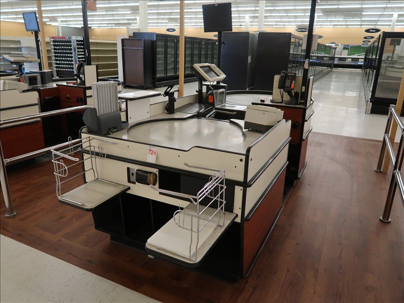 CHECKSTAND TO INCLUDE: SCANNER, SLIP PRINTER, READOUT MONITOR, CHANGE MAKER, CUSTOMER MONITOR, TURNTABLE, 12' CHROME DIVIDER & BAG STANDS