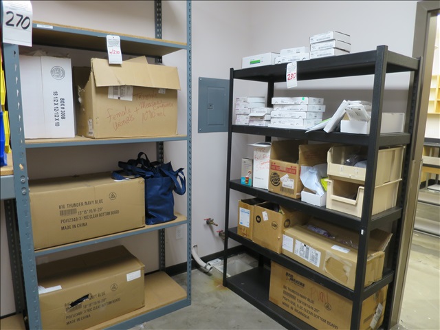 LOT, MISC FEEDING TUBES, CLAMPS, MISC MEDICAL SUPPLIES, CARRYING BAGS & (2) METAL SHELVING UNITS IN THIS CORNER (STORE ROOM)