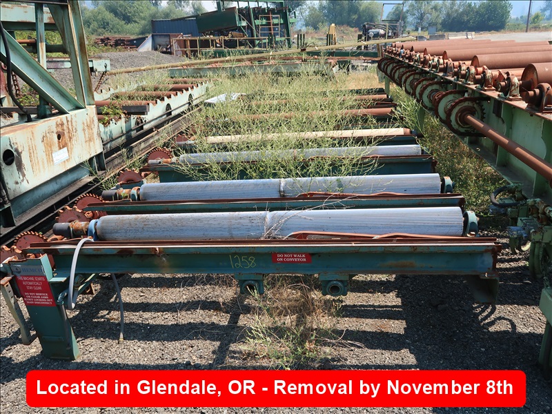 APPROX 20' HYDRAULIC POWERED ROLLCASE W/(6) 6-1/2" X 74" ROLLS, 12-ARM LUMBER SKIDS, (10) CHAIN WAYS (NO CHAIN OR DRIVE SHAFT)