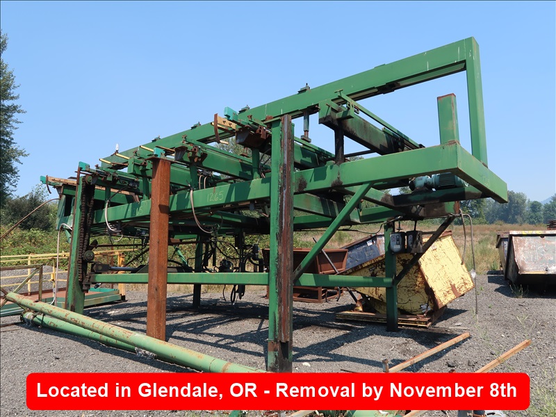 20' OVER END STACKER W/(5) LUMBER PLACING ARMS, (6) 60" LUMBER LOWERING ARMS, 4-STATION STICKER PLACER, MARKED CATWALK