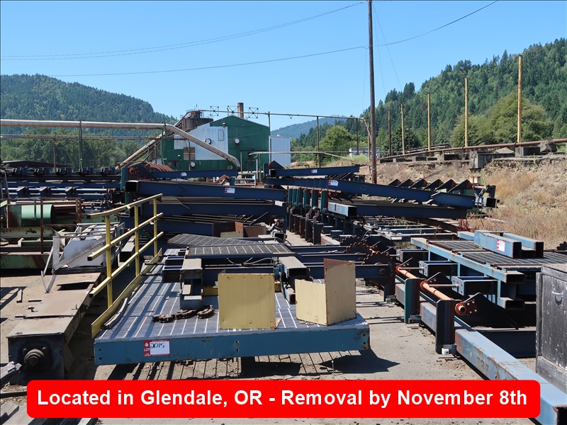 24' 42-BIN PUSH LUG SORTER, 120' 6-STRAND LUGGED TRANSFER, (4) 30' 6-STRAND TAKE AWAY TRANSFERS LOTS 2015-2022 ARE LOCATED AT PLYWOOD MILL IN GLENDALE OREGON, YOU MUST MAKE AN APPT TO PREVIEW & BUYERS ARE SOLELY RESPONSIBLE FOR THE REMOVAL & SECURITY OF THESE LOTS & MUST ABIDE BY ALL SITE RULES, ALL LOTS ARE LOCATED BY FUELING STATIONS