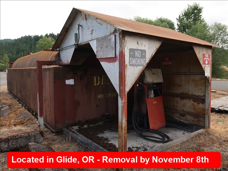 APPROX 11,500 GALLON DOUBLE WALL DIESEL FUEL TANK W/TOKHEIM PUMP LOTS 2025-2037 ARE LOCATED AT 1577 GLIDE LP DR IN GLIDE OREGON, MUST MAKE AN APPT TO PREVIEW, BUYERS OF THESE LOTS ARE SOLELY RESPONSIBLE FOR THE REMOVAL & SECURITY OF ALL MATERIALS & SECURITY OF THESE LOTS & MUST ABIDE BY ALL SITE RULES)