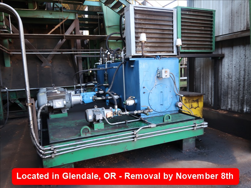 HYDRAULIC UNIT W/(2) BALDOR 60 HP MOTORS TO VICKERS PUMPS, HTS & AMERICAN HEAT EXCHANGERS, CHROMALOX TANK HEATER, TRAY, APPROX 500 GALLON TANK (NO HYDRAULIC LINES)