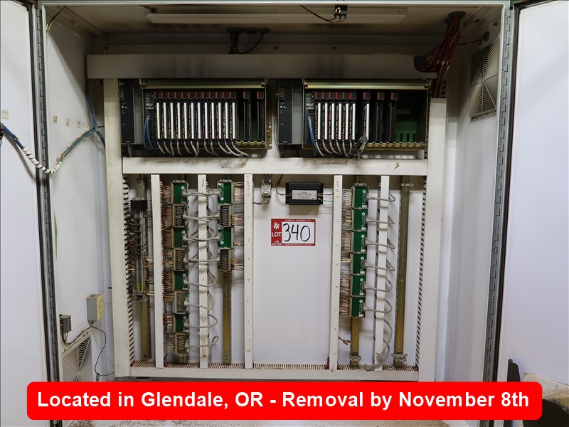 PLC CABINET W/ALLEN BRADLEY REMOTES W/(12) AC INPUT & (11) AC OUTPUT MODULES, ALLEN BRADLEY PANELVIEW 900 TOUCHSCREEN (NO WIRE OUTSIDE OF BOX