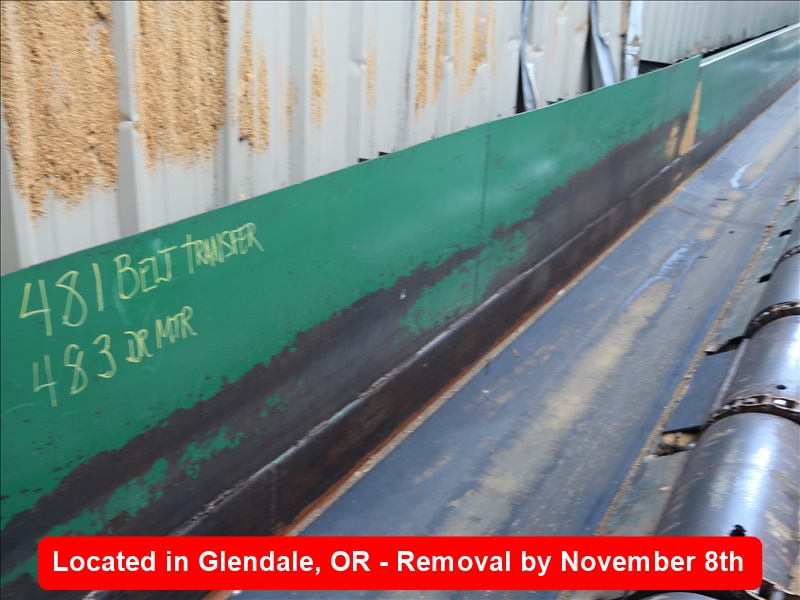 24" X APPROX 56' BELT TRANSFER BETWEEN BUILDINGS TO GANG EDGER, H&T DRUMS, STEEL TROUGH
